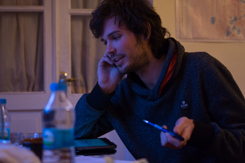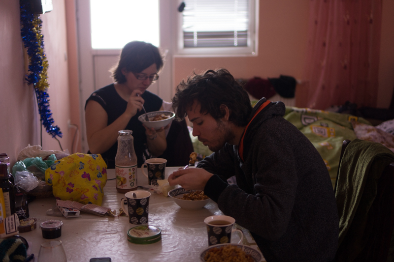 As we already got hungry, we went to go to a restaurant for dinner near Kai's old appartement in Tbilisi. Kai suggested we should visit his old flat and see if a friend of him, Nora, was there. She wasn't, but all her flatmates. Nikolos, a nice guy from Georgia, liked the idea of skiing so he joined us with the dinner and skiing on the next day.